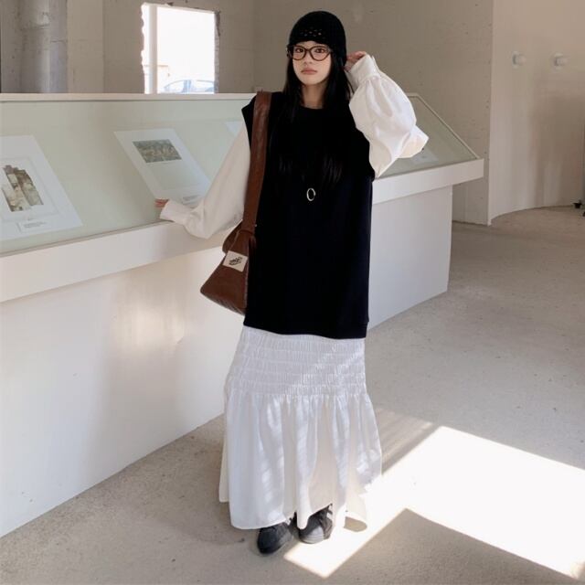 【予約販売】ワンピース レディース 切り替え バイカラー ロングワンピース ブラック 黒 こなれ感 ワンピ 大人可愛い カジュアル おしゃれ 韓国 トレンド フリー