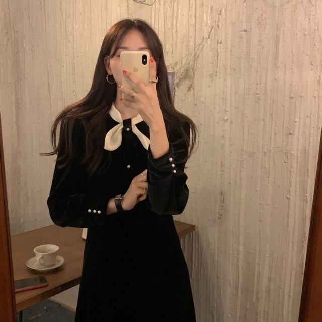 ベロア調素材にパールボタンと首元のリボンデザインが