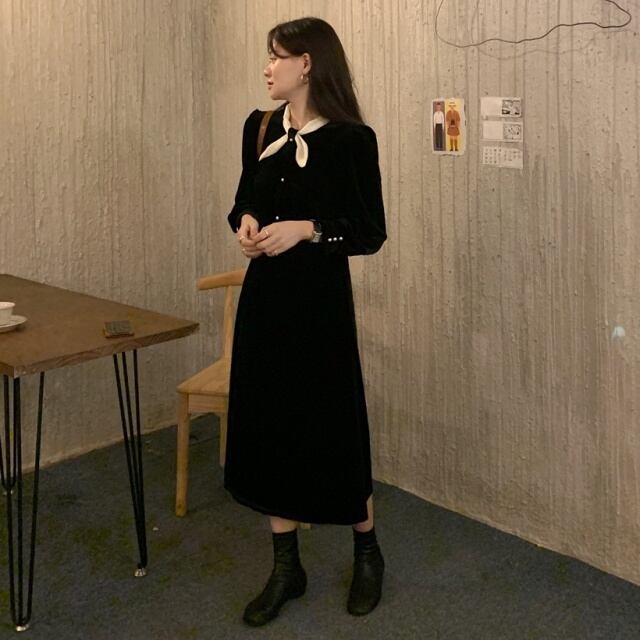 【予約販売】ワンピース レディース フレンチスリーブ ベロア ロングワンピース ブラック 黒 こなれ感 ワンピ 大人可愛い ドレス エレガント上品 韓国 トレンド フリー
