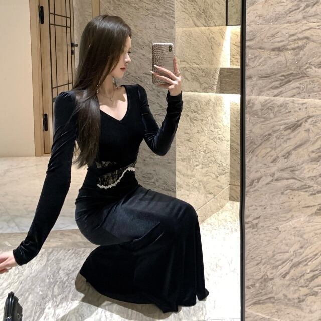 【予約販売】ワンピース レディース マーメイド ベロア ウエストマーク Vネック ロングワンピース ブラック 黒 長袖 こなれ感 パーティー 結婚式 ワンピ 大人可愛い ドレス エレガント上品 韓国 S/M/L