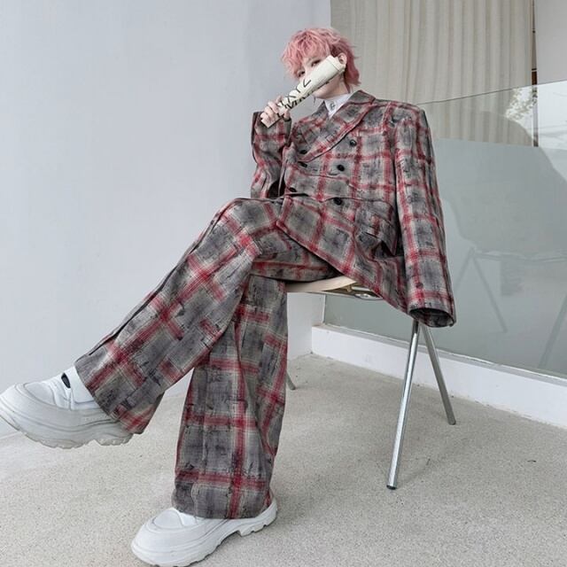 【予約販売】メンズ セットアップ スーツ レッド ブルー チェック柄 男前 スーツ ハンサム ジャケット パンツ カジュアル フォーマル パーティ 二次会 同窓会 結婚式 韓国 トレンド 春 夏 冬 秋 S/M/L