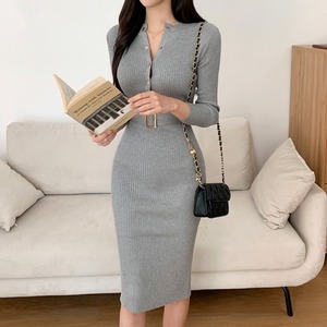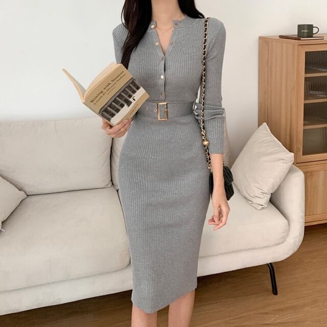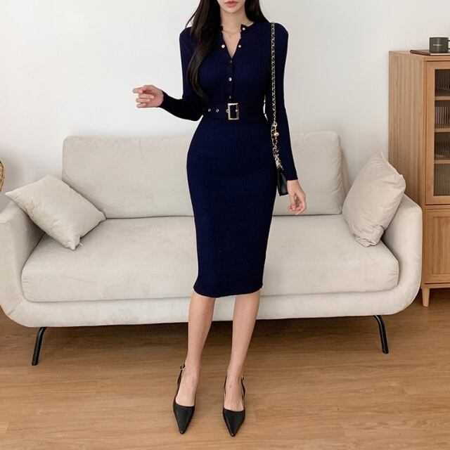 【予約販売】ワンピース レディース リブニット ひざ丈 ウエストマーク ブラック ネイビー グレー ベージュ こなれ感 卒業式 入学式 ワンピ 大人可愛い ドレス エレガント上品 韓国 フリーサイズ
